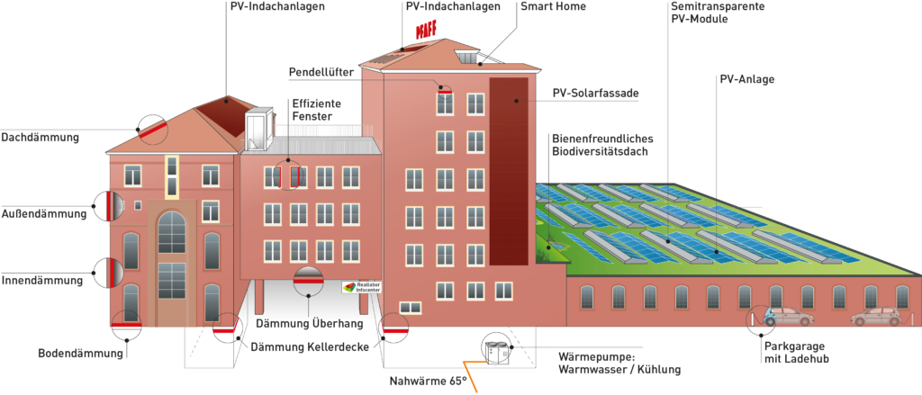 Ausgangspunkt war ein städtebauliches Vakuum: Rund 20 Hektar innerstädtische Fläche in Kaiserslautern, jahrelang ungenutzt. Die Stadt erkannte die Chance, hier nicht abzureißen, sondern Bestehendes zu revolutionieren und Neues auszuprobieren. »EnStadt:Pfaff« wurde eines von sechs bundesweiten Modellprojekten im Rahmen einer Förderung des Bundesministeriums für Wirtschaft und Energie (BMWK) und des Bundesministeriums für Forschung, Technologie und Raumfahrt (BMBF). Eine der größten Herausforderungen: der Umgang mit dem Bestand. Viele Gebäude waren energetisch veraltet, einige standen unter Denkmalschutz. Ein Abriss kam bei zentralen Gebäuden nicht infrage. Stattdessen wurde experimentiert. Zum Beispiel mit einem ehemaligen Verwaltungsgebäude, dessen Fassade erstmals mit integrierter Photovoltaik ausgestattet wurde. Nicht jeder Ansatz erreichte den höchsten Effizienzstandard, doch genau darin lag der Forschungscharakter des Projekts. Hinzu kamen Altlasten aus der industriellen Vergangenheit, komplexe Genehmigungsprozesse und politische Abstimmungen. Die Entwicklung verlief deutlich langsamer als ursprünglich geplant – eine Erfahrung, die Dr. Elberzhager als zentrales Learning beschreibt: Stadttransformation braucht Zeit.