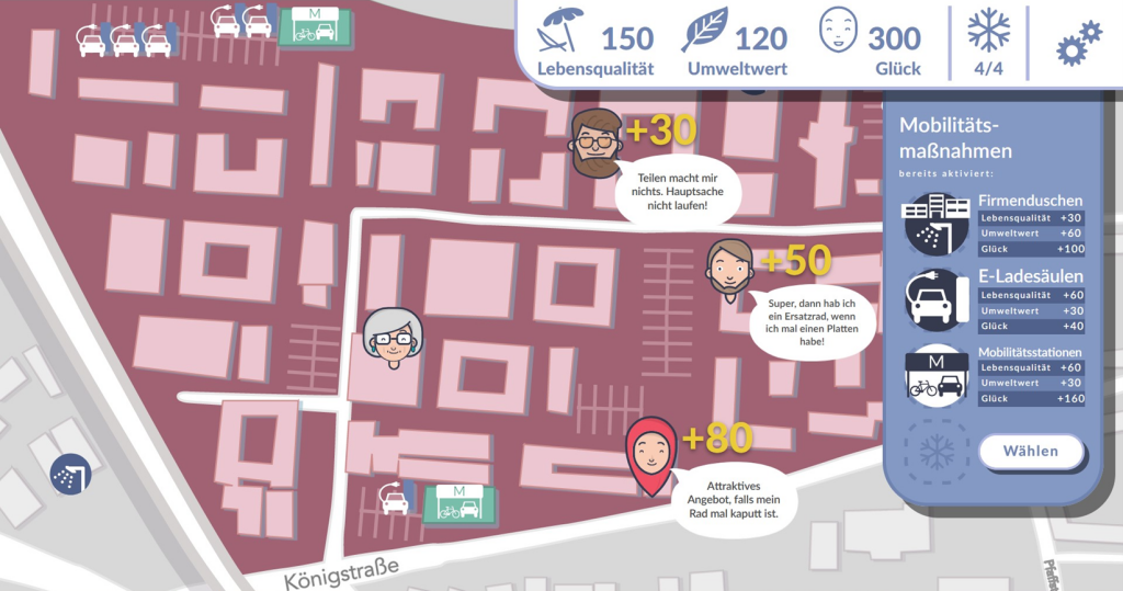 Einen spielerischen Zugang wählte das Team mit »MiniLautern«. Der Webdienst machte neue Mobilitätskonzepte erfahrbar und zeigte bewusst auch ihre Konfliktlinien. Autofreies Wohnen schafft Raum und senkt Emissionen, wirft aber praktische Fragen auf: Wie lassen sich schwere Einkäufe organisieren? Solche Spannungen sollten sichtbar gemacht werden – nicht als abschließende Lösungen, sondern als Ausgangspunkt für Diskussion und gemeinsames Weiterdenken. Mit »KLara«, einer Augmented-Reality-Anwendung, ging das Projekt noch einen Schritt weiter. Nutzer*innen können sich Geschichten zur lokalen Wertschöpfung anhören und visuell nachvollziehen, wie wirtschaftliche Kreisläufe in der Stadt funktionieren, wer daran beteiligt ist und wie sie unterstützt werden können. Ergänzt wurden diese Anwendungen durch eine digitale Pfaff-Landkarte, die alle entwickelten Dienste bündelt, Zugänge schafft und teilweise auf begleitende YouTube-Videos verweist. Sie dient zugleich als Überblick und als Dokumentation des Projekts.